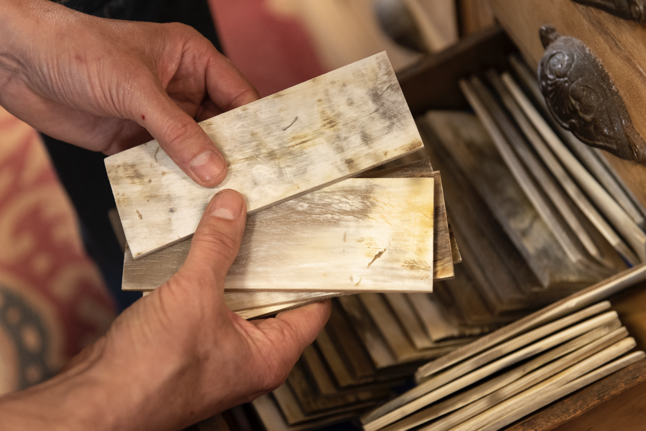 Choisir la nuance parmi une large gamme de plaques uniques en corne de buffle et déterminer l’épaisseur ou la finesse de la monture